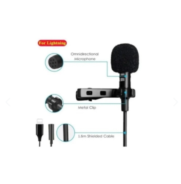 MICROFONO LAVALIER. Fácil de usar Micrófono de condensador omnidireccional.Maneja poco ruido.Alta calidad del micrófono, ideal para uso de video.Frecuencia: 20HZ-16KHz. Conector: lightning. Largo del Cable 1,5m (59').Peso: 25g.